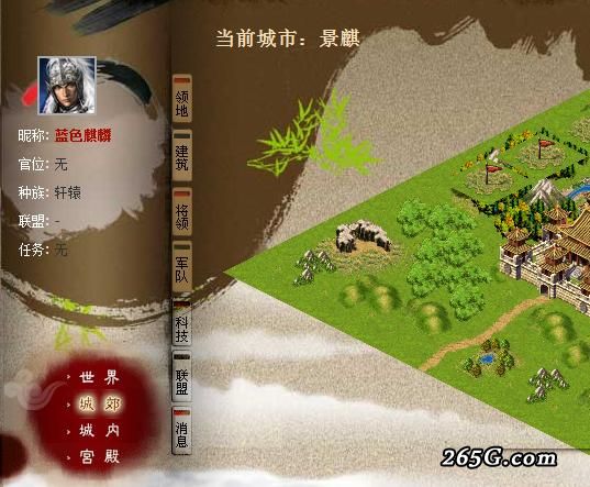 进入游戏之后,会进入一个古色古香的地图界面,界面的左侧有简要的个人信息、指令按钮和各项地图切换按钮(包括世界、城郊、城内和宫殿),而界面右侧正处于“城郊”项目的地图,一座古朴的城市建筑和周围优美的林木、山石风景构成了地图的全貌。点击“世界”按钮时会出现你周围的所有地貌和其他城市,将来的攻略、同盟等外交活动可少不了仔细参详一番,“城内”和“宫殿”按钮分别会切换到城内建筑和宫殿里的设施风貌,城内与城郊一样拥有四块空地,可以进行民居和仓库的建设,而宫殿的主要功能是对府院的建设升级,这可是所有建筑的基础哦,轻视不得。