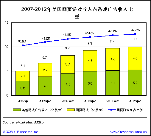 根据权威机构艾瑞咨询公布的数据显示,2007年美国游戏广告收入的40.8%来自于网页游戏,而且这个比例在今后的5年间将持续上升,到2012年,网页游戏广告收入将占到游戏广告总收入的47.8%,由此可见,美国的网页游戏已经从个人用户市场走向企业用户市场。