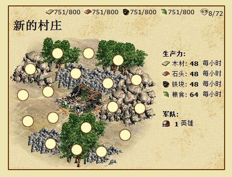 村庄外围有四种资源矿:石头、木材、铁矿和粮