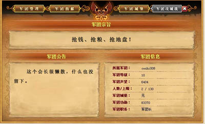 军团消耗:当军团有了自己的建筑物之后,或是军团的人口数超过了军团所能有的人口上限,军团将面临持续的物资消耗。消耗的物资将直接从军团仓库中扣除,如果军团仓库中资源的补给跟不上资源消耗的速度,则将导致军团建筑的耐久降低。于是需要军团成员为军团捐献出自己一定的物资,确保军团持续稳定的发展。