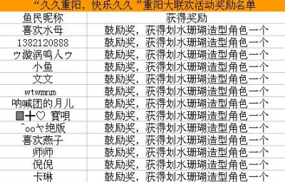 以下是昨晚活动的获奖名单,没有得到奖励的小鱼们不要气馁哦,海底世界每天都有丰富的活动可以拿到奖品,请关注官方公告哦~