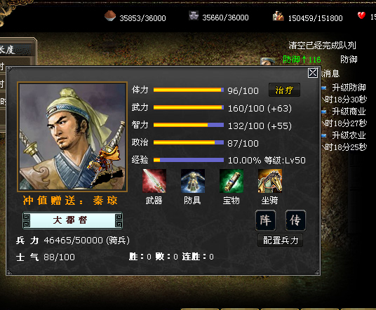 坐骑:追风(猛将爱用的名驹。武将出征阵亡率减小55%,路程时间减少55%)