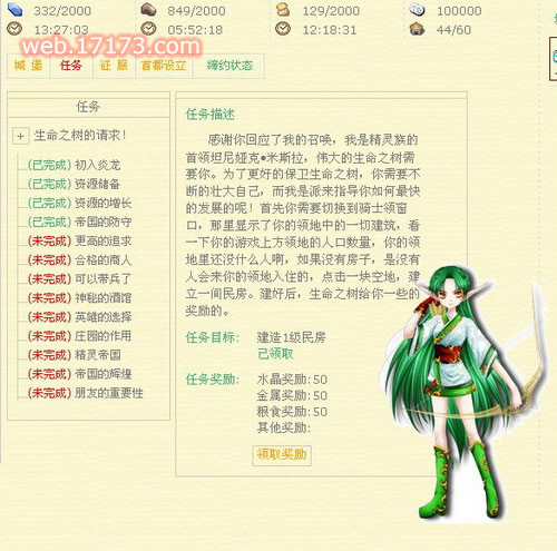 相对于新手而言,就算没有接触过这类的游戏,也不用担心自己无法上手,游戏窗口的左边有着任务菜单,新手玩家可以通过这里发布的任务,来进行对整个游戏世界的认识,还能换取到不错的物资奖励哦!当然,同时还能通过游戏帮助菜单,查看相应种族的各项建筑建设条件,科技与兵种的研究……等等一系列的帮忙都能在这边找到。