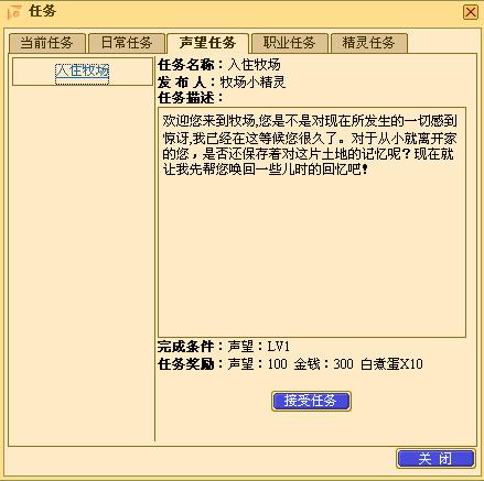 1.首先接下“入住牧场”,任务完成条件是声望达到LV1,因为您进入游戏的时候已经是声望LV1了,所以可以直接完成任务。点击“接受任务”后,切换到“当前任务”选择“入住牧场”,然后按下“完成任务”按钮即可领取金钱、声望和白煮蛋。