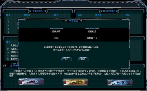 每天零点以后,在你当日第一次登录游戏时,系统会自动弹出“考古”的页面。把您的鼠标移到最下面的三个闪动的图标中的任意一个,点击它,您可以看到您已经发现了任意数量的金属(晶体/核能),还有不同的道具:各种类型的时间控制器、卫星、轻型战舰、不同的运输舰等等