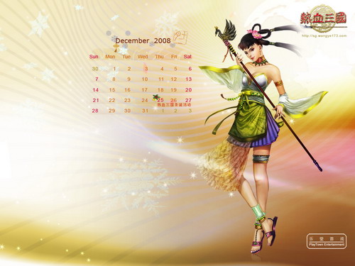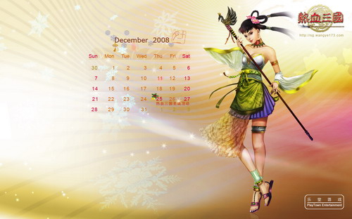 今天是2008年12月的第一天,《热血三国》官方运营团队乐港科技在此祝福大家在新的一个月中31天天天开开心心, 744小时时时快快乐乐, 44640分分分健健康康, 2678400秒秒秒幸幸福福! 送上我们准备的新年第一份礼物—2008年12月份精美月历壁纸,每一个HAPPY DAY,我们都会陪伴在您的身边!