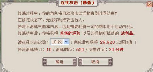 另一种战斗方式,即连续攻击模式,也就是对单一的野外怪进行连续性的打击。可以选择对野外怪的打击次数,最少的1次到最多的10次。攻击次数完以后才会结束战斗,攻击次数不同,获得的经验也不一样,消耗的精力,金钱还有需要的时间都是不一样的在修炼过程中可以选择立即完成或者中止修炼,立即完成的话会消耗黄金(可通过充值获得)中途停止修炼只能获得部分的经验。