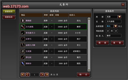 为了方便玩家之间进行交易,《武林帝国》的市场功能里面,集成了拍卖系统,玩家可以在拍卖行里购买或者出售装备、道具、坐骑、武将(武将只能压缩成魂珠后 方后拍卖出售,以及各种战利品。商业的发达,也是文明的重要标志之一:您可以从市场上与其他玩家直接交换物品,也可以通过向其他玩家拍卖而赚取金钱。