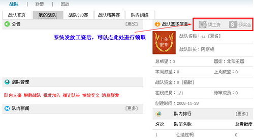 加入战队后,便可发起和接受战队比赛了,战队比赛获胜后,战队将可获得50战队威望,失败方,将扣除50战队威望,在战队首页可查看到战队排名,战队排名将根据战队的威望高低来排序。每周系统会奖励给排名靠前的战队一些奖金,这些奖金,队长可以对这些奖金进行分配,作为奖励发放给队员。