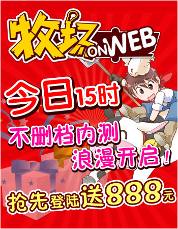 今日15时,让众多玩家们期待已久的田园爱情游戏——《牧场onweb》不删档内测浪漫登台!首款含战棋元素的网页游戏,唯一一款完全以田园生活为背景题材的网页游戏,市场上独一风格、独一类型的网页游戏,邀您共游世外桃源!内测开启同时,四大精彩活动同步上阵。现金888元、商城点2250点、10000牧场币等精彩活动好礼等你来领取!