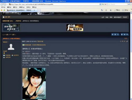 最近,在被誉为网页版星际的《星际帝国》论坛中,惊现了一位借论坛出位的美女。此“SM女王”非彼SM女王,这位玩家通过自曝照片的方式,在论坛中引起玩家的对女性玩家的高度关注。她在《星际帝国》建立了名叫的“SM”的军团,并自封女王!具了解,SM女王此次的举动是为了希望通过公开自己的照片,来得到更多游戏人群的关注。