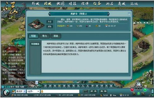 《江山》的操作系统同样是传统的战争策略游戏操作系统,简单又复杂。鼠标只需要轻轻点击,就可以进行建筑、征兵、掠夺等一系列军事、内政命令。无需要玩家执行多余的操作,节省时间,让玩家有更多的时间专心于内政建设或者军事战斗中去,还原战争策略游戏本质。顶部为切换地图,查看信息等快捷键;中间为当前地图、信息;底部则为资源列表、聊天频道、各项功能,建筑快捷键。右上角有个小小的建筑、科技、征兵和道具的显示栏,非常人性化设置。