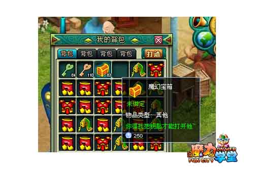 传说无忧大陆上存在着一种连通各种空间的奇特宝箱,被称为“魔幻宝箱”。通过任务或是挑战特殊怪物,玩家就可以将这些宝箱占为己有。只要取得特殊的钥匙,就能开出各种道具,甚至是打开传说中通向异空间的门扉!目前已知功用的有黄金钥匙(金票)、铜质钥匙(新手奖励),其它更为珍贵的神奇钥匙,需要玩家自己去游戏里找寻!