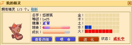 精灵信息资料里面,会显示出精灵当前状态。根据玩家的照料情况,精灵会出现正常、饥饿、疾病、死亡四种状态针对不同的状态,玩家需要采取不同的方法来照料好小精灵。饥饿的时候要喂食料理,疾病的时候要到商店里的买药给精灵服用、精灵不慎死亡后要到商店里购买“精灵复活药”复活精灵。