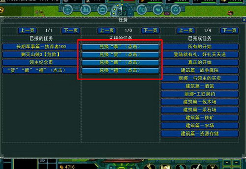 利用自己手上的各种资源,就可以兑换到“恭”、“贺”、“新”、“禧”四样物品。例如,使用300木材、400石头、500铁块、600粮食和100金,可以兑换到“恭”。
