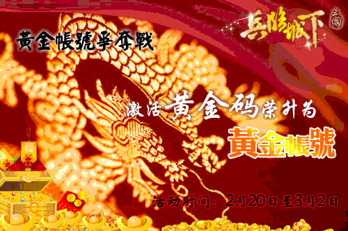 至3月2日14:00,九~十二服联盟点数1000万以上,且盟成员不少于20人的联盟,将获得限量黄金码10枚;联盟点数10000万以上,且盟成员不少于20人的联盟,将获得限量黄金码20枚。激活黄金码即可将普通帐号升级为黄金帐号!