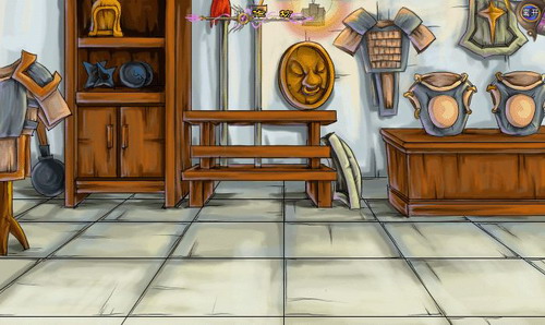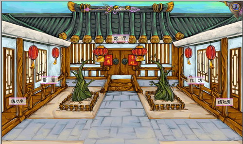 开启家园大门,如临仙境一般的世外桃园:习武品茗、修身养性、快意江湖。展现在面前的是一个古代风格的庭院,庭院中有5个古门分别可进入不同的房间:客厅、两间卧室、作坊、两间练功房。