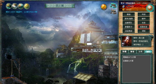 城市内部:城市内部界面中,玩家可查看当前城市所拥有的建筑物数量,等级,并对建筑物进行操作,如升级,生产士兵,生产装备,招募武将等。