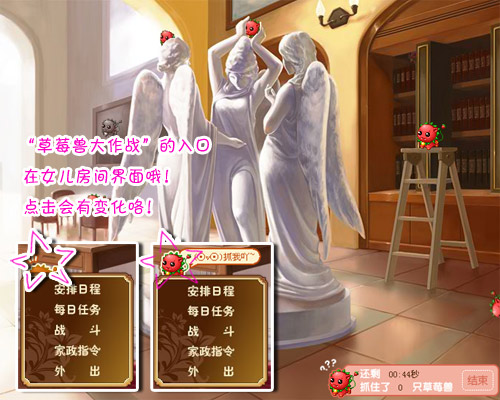 ·草莓兽大作战:哈哈!~~还记得吗?之前有曝料说过“草莓”绝对是MM世界中的KEYWORD(关键词)!这不,之前刚刚介绍了甜美的草莓娘战斗造型,现在又马上出现了爆可爱的“草莓兽”!那么,草莓兽大作战到底是怎么回事?其实MM梦工场中内置的一个休闲小游戏,在规定的时间里抓到足够数量的草莓兽,就可以获得宝箱和钱包奖励哦!