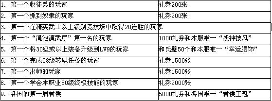活动内容:在活动期间,第一个达到以下条件的用户,系统将全服通告,其大名将被永远载入《武林英雄名人史》,并获赠礼券。