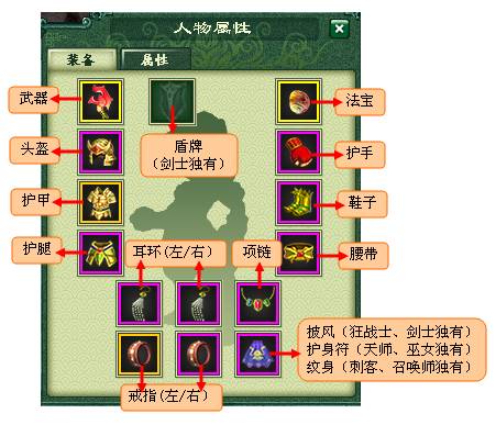 武器、头盔、护甲、护腿、护手、鞋子、腰带、戒指、耳环、项链、盾牌(剑士独有)、披风(狂战士、剑士独有)、护身符(天师、巫女独有)、纹身(刺客、召唤师独有)