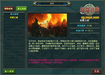 《热血三**,推出了战场系统,让玩家对于整个游戏有了新的体验和认识。本次推出的战场系统包括:剧情战场和据点战场。其中剧情战场是指PVE战场,主要目标是强力NPC。玩家可个人或组队进行扫荡。而据点战场是PVP战场,玩家之间对战场中的据点、任务物品进行争夺。玩家可以单独,或者组队进行战场任务。