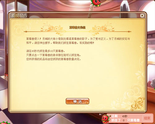 在MM内测当天,月城中就贴出了“草莓兽大作战”的告示,月光女神热切呼吁广大玩家“为了爱与正义,为了月城的安定与和平”踊跃伸出援手,竭力抓住草莓兽!为此,女神还准了大量的宝箱与月币,准备奖给那些成功抓到草莓兽的人!