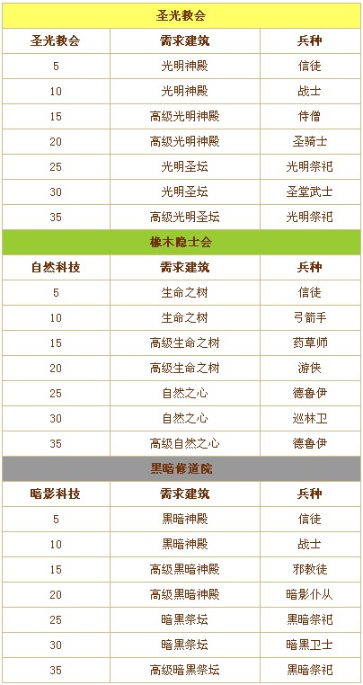 神术科技:神术科技对应橡木隐士会、黑暗修道院和圣光教会则分别是:自然、暗影和圣光。因为神术科技的等级决定了玩家可以生产什么样的兵种,对玩家的军事起着非常大的作用,所以有些玩家又将神术科技成为“主科技”。那些立志要成为笑傲提阿马特的大狼们可一定要优先考虑神术科技啊。