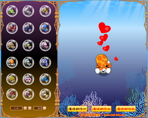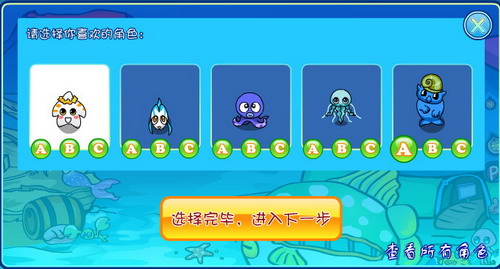 在注册海底世界游戏的开始,海底世界就提示你选择你的海底造型,并且初期就提供了多达5个不同的海底造型供新来的用户选择,用户在选择角色的时候,点击A、B、C按钮就可以欣赏每一个角色的魔法动作。