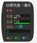小贴士:如伴鱼自身属性中的饥饿值为0%,或是生命值为100,该伴鱼将不再有增加“泡泡鱼”属性的能力。系统将会以 图标提醒玩家。