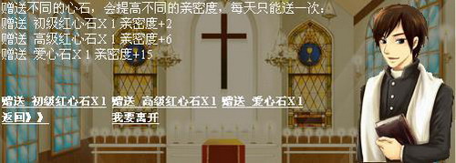 结成夫妻之后,夫妻之间就可以相互向对方表示自己的好感了!通过不断提高夫妻之间的好感度,不仅可以向世人展示你们的恩爱,还可以获得更多夫妻专有功能哦!那如何提升好感度呢?让我们来问问神父吧!进入教堂,与神父交谈并选择“提高好感度”。