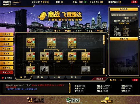 全球首款免费创业网页游戏《商战飞黄腾达》,真实的企业架构,高度拟真的商业竞争,进入《商战飞黄腾达》的你将直接升至CEO,开始一段美妙的创业之旅。全新商盟战争,让你体验加倍的快感,在《商战飞黄腾达》里激情每一天!