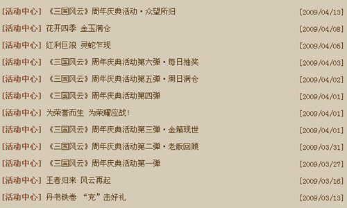 虽然《三国风云》系列周年庆典活动已经进入了尾声,但是,在2009年4月14日0时——4月20日23时,《三国风云》又为玩家们奉上了众望所归整点在线抽奖的全民活动。在活动期间的每个小时的整点时间,《三国风云》游戏系统将在每个服务器中随机抽取一名幸运玩家,所有服务器中整点时间在线的玩家都有机会被选中,获得系统发出的恭喜获奖的邮件,同时,系统也会将一份神秘大将放入获奖玩家的藏宝库中。各位玩家朋友们千万不要错过这个机会,也许神秘大奖就会从天而降落入你的手中!
