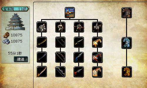 巧妇难为无米之炊,带兵打仗也要有精良的装备才行。《魔幻三国志》中的武器工房是打造兵器及铠甲的重要场所,武器工房的等级越高,就能打造出更高级别兵种的必备武器和战甲。在这里要提醒玩家,任何兵种都需要盔甲,所以盔甲一定要多准备,不要让兵器和盔甲成为大家练兵的瓶颈。同样,练兵的军营等级越高,玩家们就可以训练更高级别的兵种,兵种级别越高,部队的战斗力也就会大幅度的提升,让你在战场上更能大展军威。