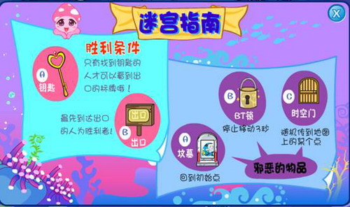 迷宫游戏位于海底世界深海裂缝场景,为多人联机游戏,进入游戏中,必须要在漆黑的游戏场景内快速的找到钥匙到达终点,途中还会制造各种障碍,有的会被随机传送到游戏地图中的另外一个点,有的会被停止移动三秒钟,有的还会将你传送到游戏中的初始点,所以要尽量的避开障碍哟!