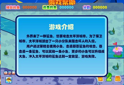 太平洋城保卫战游戏在海底世界深海海沟场景,是广受青少年喜欢的游戏之一,在本游戏中,玩家作为包围太平洋城的战士要极力的阻止凶恶的鲨鱼的入侵,派出组织鲨鱼进攻的5类“战士”还可以升级,成为更加强大的战士,本游戏设计了110局,但是也有部分喜欢这款小游戏的玩家通关咯!