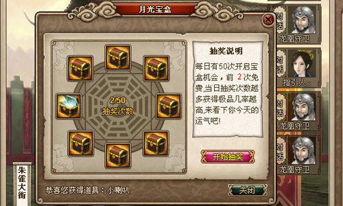 正所谓“一文钱憋倒英雄汉”,各位大侠出门在外走南闯北,腰间没有盘缠怎么行?各位玩家别担心,只要你登陆《武侠风云》,系统每天都会送出300元宝!这可是“真金白银”啊,足够玩家们在江湖上吃喝玩乐了,而且还能在道具商店中买到众多琳琅满目的心仪商品,真是各位侠客们千载难逢的一大幸事啊。另外,玩家在游戏中点击“月光宝盒”,每天还可以获得两次免费抽奖机会,众多超值大奖等你来拿,这么好的事情,一般人我可不告诉。