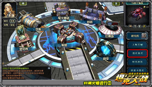 当你和你的坦克都达到了可进行换代的等级,并准备好所需材料,就赶紧到广场上,找到研究所。点击研究所一栏,会出现如图四个选择项,赶快点击强化换代框。开始神奇坦克换代之行!
