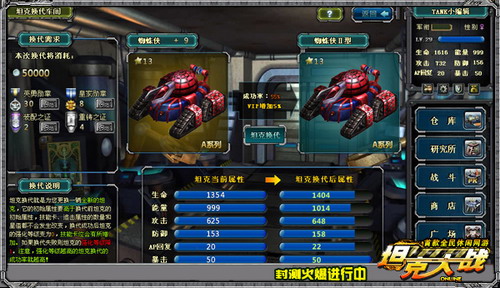 坦克换代对玩家和坦克的等级都有要求。玩家等级最低达到15级,坦克等级最低为5级。新手坦克不能进行换代。坦克换代分为低、中、高三个档次,各自要求最低等级为15级、25级、40级。15级的玩家只能进行一次坦克换代,可以将原始坦克进化成低档,而40级的玩家则可以完成三次坦克换代,最高能将坦克进化成高档坦克,威力大增。