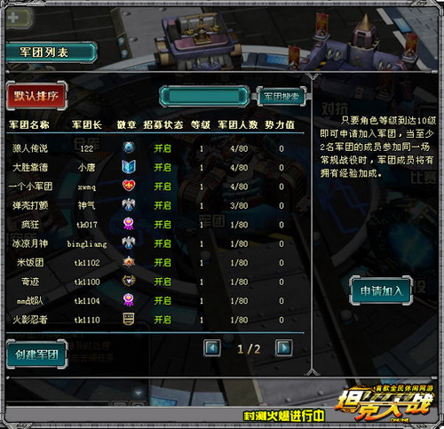 达到10级的玩家可以申请加入军团,无需任何费用。点击广场上的“军团”进入军团的操作界面,玩家可以在军团列表中选择自己想要加入的军团,或者使用“军团搜索”找到朋友的军团加入。