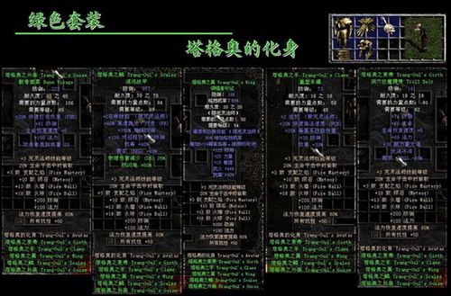 套装装备:套装装备一般由数个不同部位的装备组成,当英雄同时穿上所有套装部件时,将获得额外增加的宝物属性,能力将得到极大的提高。套装部件越多,收集的难度就越大,但是组合起来的套装装备的能力就越强大,收集齐一套完整的套装装备将成为所有玩家的梦想。