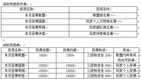 活动规则:1.每月最后一天评选出龙虎排行榜各奖项,分别为:本月至尊联盟,本月至尊国君,本月至尊军阀,本月至尊侠客