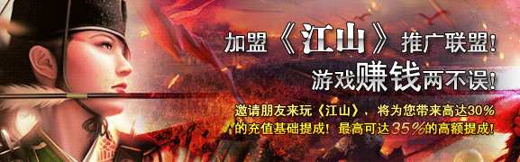 江山推广联盟!只要您帮助江山宣传,让更多的人加入游戏,便能按比例从他们的充值中获取推广酬劳!最高分成可达35%。您心动了吗?那就赶紧行动吧!从此游戏赚钱两不误,来吧您会因此而成为一个优秀的推销员!
