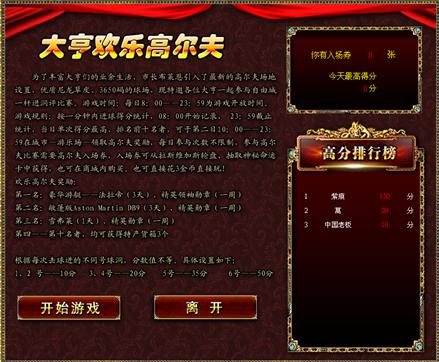 高尔夫场开放规则为:每天10:00——22:00,游戏规则,一分钟内进球最多者获胜,10:00开始记录,然后22:00截止统计当日最高分数者,排名前三者,可于第二日10:00——22:00可在城市—游乐场—领取高尔夫奖励,每日参与次数比限制,参与高尔夫比赛需要高尔夫入场券,入场券可从拉斯维加斯轮盘、抽取神秘命运卡中获得,也可在商城内购买,3金币每张。