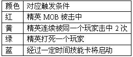 精英MOB血条上有三个亮闪闪的小星星,遇到一定的触发条件会变亮,亮的时候就表明他的技能卡被触发了,这时候你最好离他远点,不然就是被打或者掉血之类的惨状!灯闪着表明不会被触发,赶紧趁机多开几炮。灯灭了就表明技能卡不起作用了,精英MOB的杀伤力也随之下降。随着触发条件的不同,小星星也会出现不同的颜色。具体的触发条件和显现的颜色如下表所示。