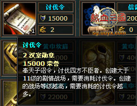 这里先来看看“讨伐令”的说明:奉天子诏令,讨伐四方不臣者。创建大于11级的剧情战场,需要消耗讨伐令。创建的战场等级越高,需要消耗的讨伐令越多。