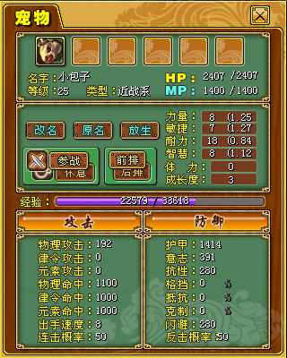 宠物系统的学问可大了,同种类型的宠物因为前缀不同在发展过程中也会具有全然不同的战斗属性,比如说丛林**﹑金皮**,因为名称前缀(就是**前的那小小两字)不同,两只**的属性和成长率都是不同。瞪大眼睛才能选好极品宠物。