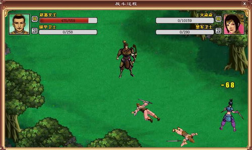 游戏中玩家可以在擂台、武馆野外等地触发战斗,从而进入战斗。战斗过程为不可控,所有的流程都是由玩家属性来决定的。其中:武力决定了普通攻击的命中和伤害,灵巧决定了个人决斗中技能攻击的命中和伤害,幸运高的人特技的发动几率也较高。另外战斗的表现形式分为动画型和文字型两种,玩家可以随意查看。