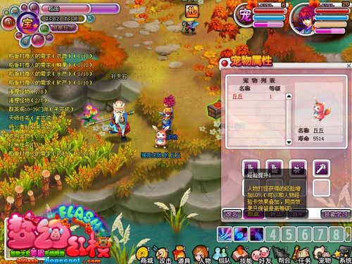 《梦幻红楼Flash》中的MM玩家都如同水做的一般仙灵纯净、温润如玉,天生对可爱的事物无所戒备、来者不拒。英勇帅气的GG们如果带上一只超Q的丘丘做自己的小跟班,一定会让你在MM心中的印象加分!丘丘就像一个永远也长不大的小捣蛋,东奔西窜,惹人怜爱。而且它天生机敏,有时还会跑到主人前面带路。两人带着小丘丘一起游山玩水、历尽艰险,是不是很浪漫呢?