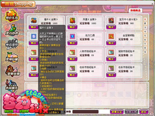 为了让玩家体验更多的乐趣,《梦幻红楼Flash》官方目前已经对道具商城进行了全新的升级,包括特价礼包、灵丹妙药、灵神仙铺、宠物坐骑、休闲娱乐几大系列。其中不仅有神气活现的可爱坐骑福牛和凤凰,也有威风凛凛的战斗宠宝贝牛,除了能使玩家的综合属性能力有一个质的飞跃,带出去溜达一圈,好好炫耀一番也不失为一种乐趣!